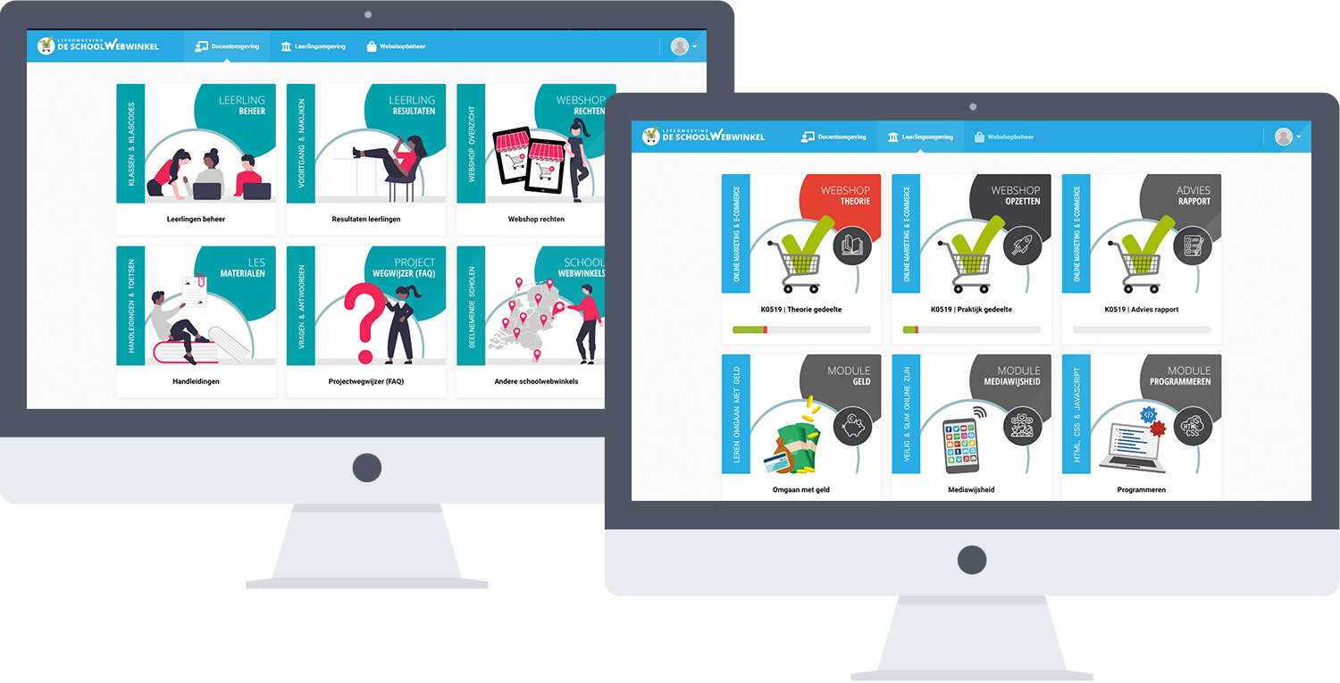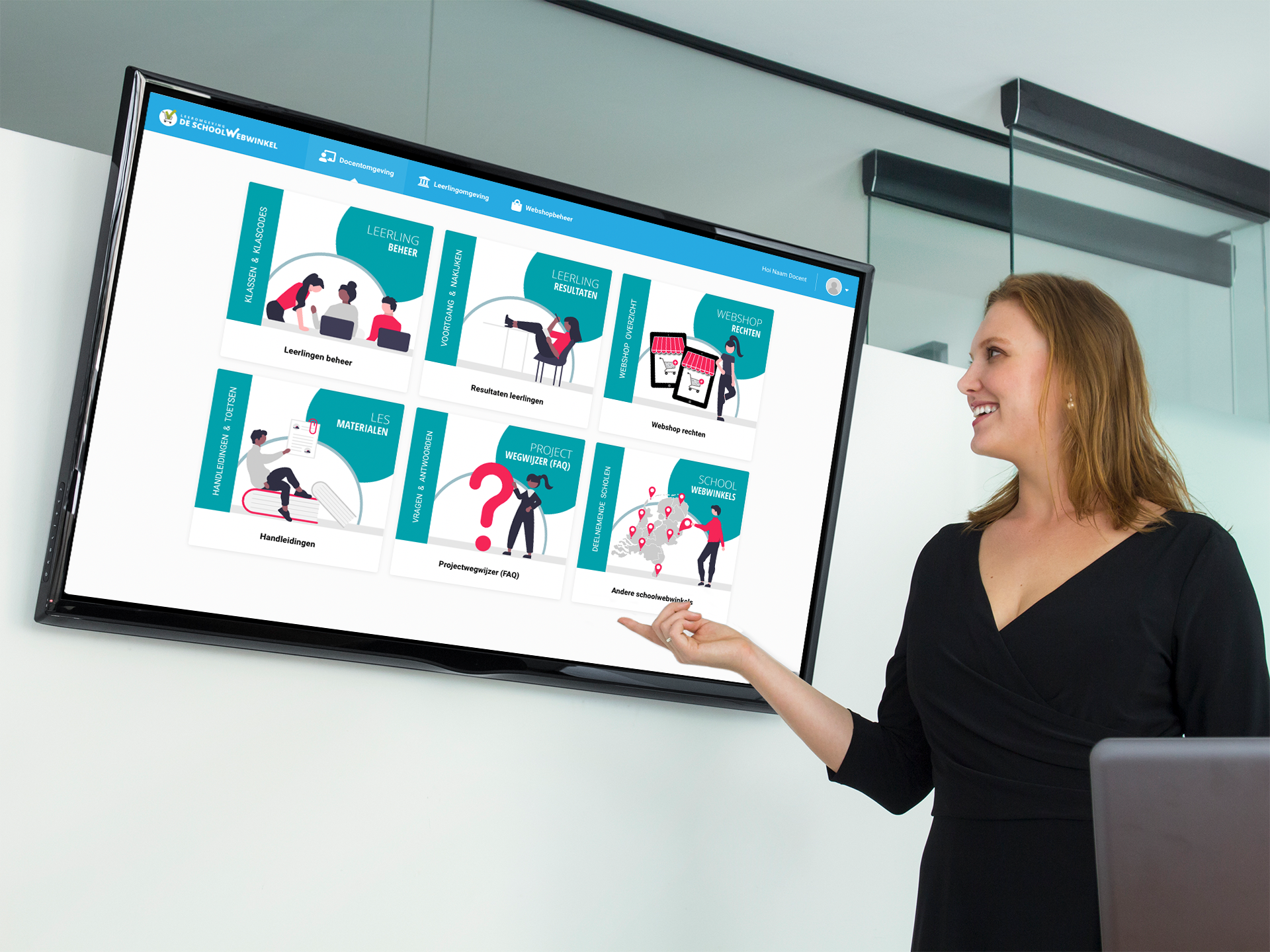 • De Schoolwebwinkel bestaat uit één platform waarin de theorie, de opdrachten, de webshop en de CMS handleiding staat.